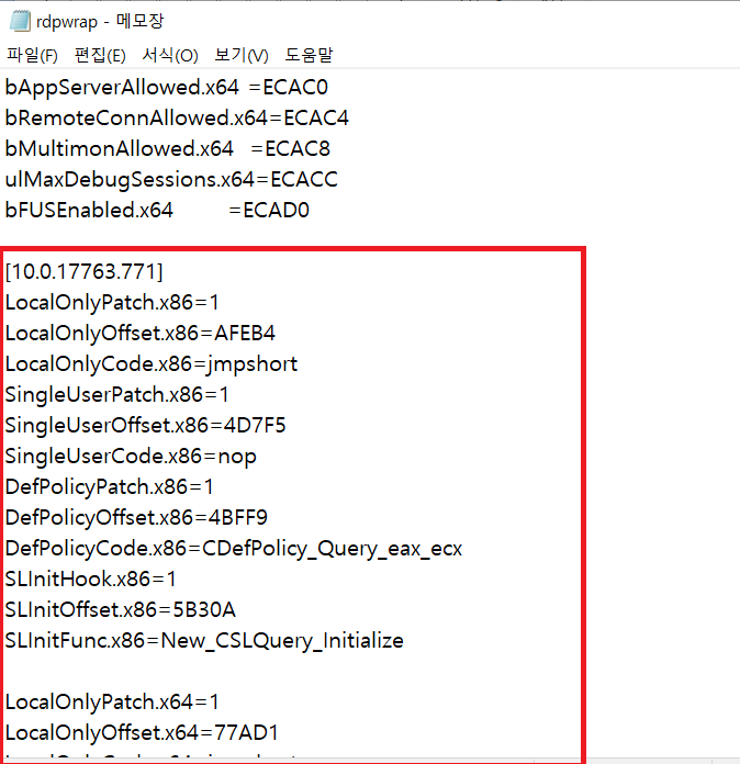 해당 게시글에 있는 전체 코드를 복사해서 "C:\Program Files\RDP Wrapper\rdpwrapper.ini" 파일에 삽입
