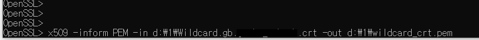 x509 -inform PEM -in d:\1\wildcard.crt -out d:\1\wildcard_crt.pem