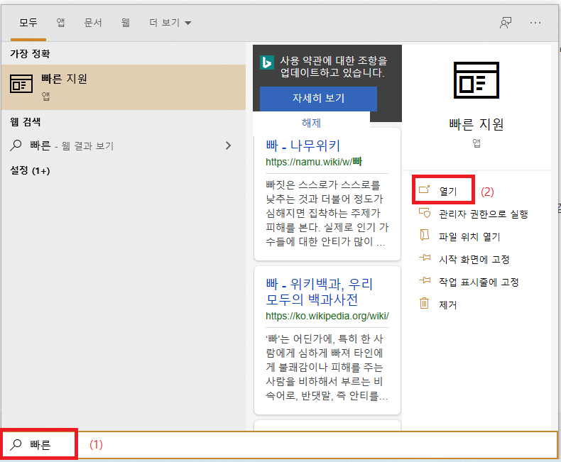 1. 윈도 시작 > 검색 클릭해서 "빠른 지원" 검색 후 열기